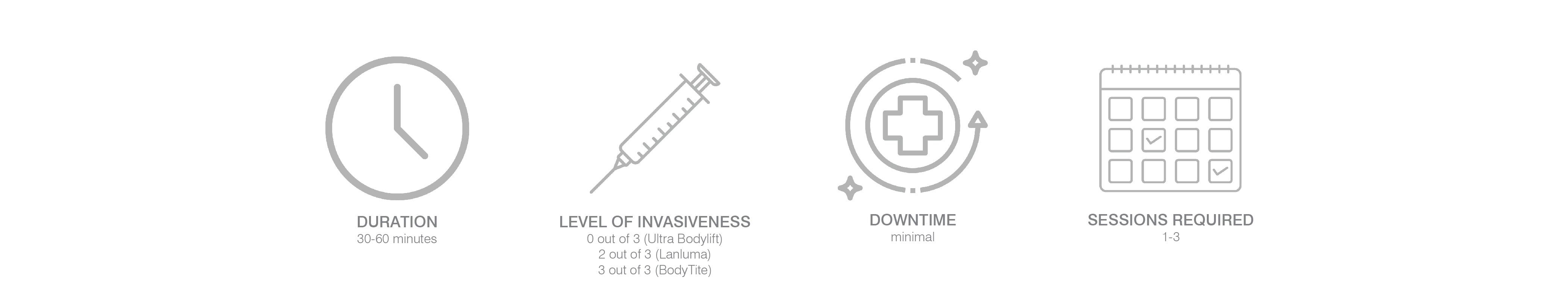 The level of invasiveness that is preferred will determine the downtime required after treatment. BodyTite is the most invasive and requires only a few days recovery. The non-invasive treatments may require multiple sessions to achieve the required results.